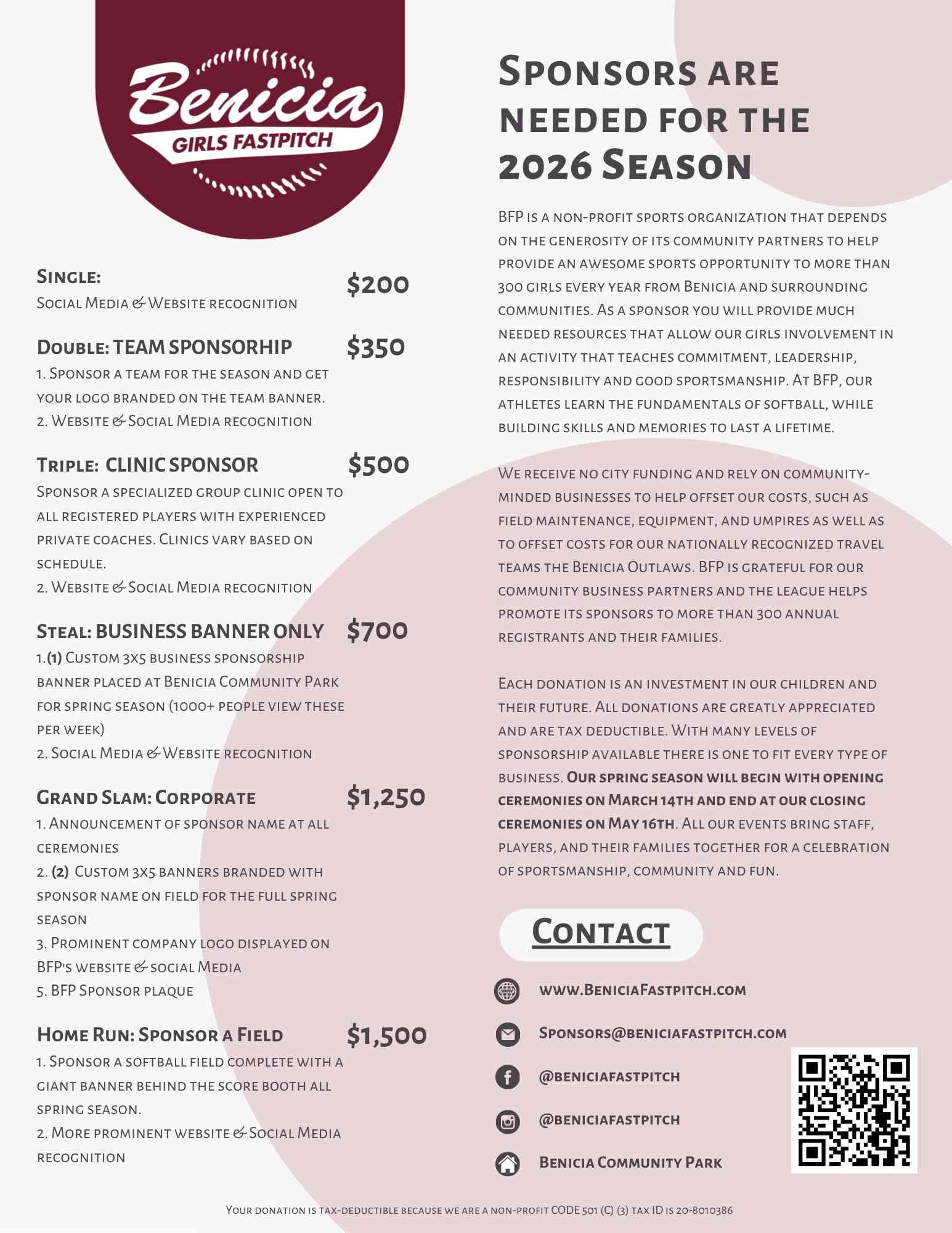 If you purchase a Grand Slam or Steal sponsorship, banners are defined as a personalized 3x5 vinyl banner referencing your business logo and QR code to your website to be hung on our field fencing at community park throughout the season (weather permitting).