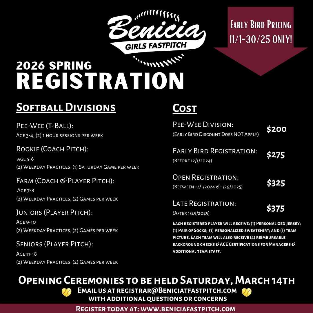 Benicia Fastpitch has 6 divisions with players ranging from age 3 to age 18