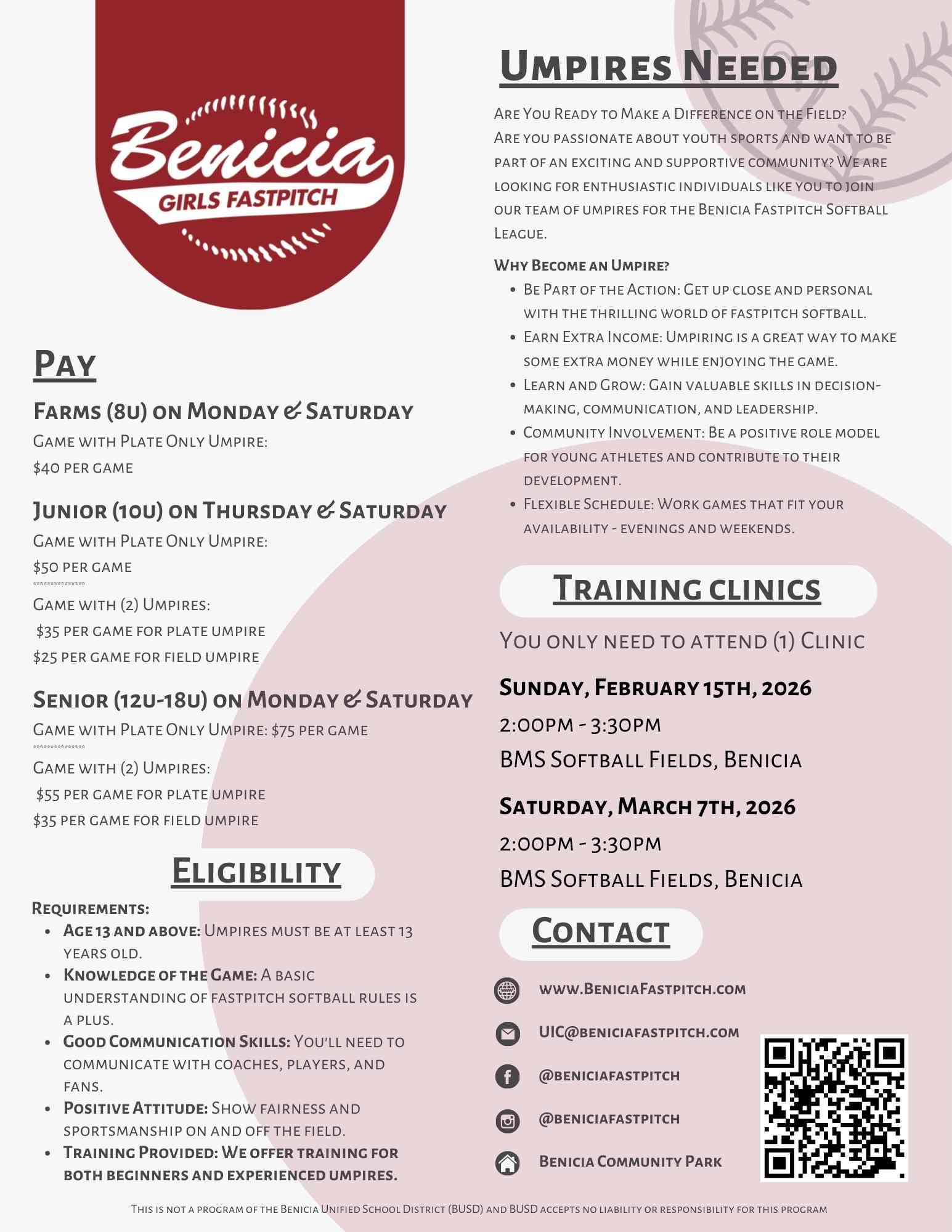 Become a vital part of our Youth Fastpitch Softball League! Join us as an umpire and help create a positive and exciting experience for our young athletes. Your passion and dedication can make a big difference!